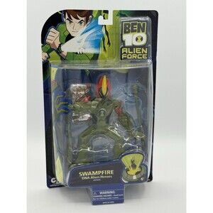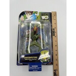 Unleash the power of Ben 10 with this highly sought-after, NOS (New Old Stock) 2008 Ben 10 DNA Alien Heroes Swampfire action figure by Bandai. Standing at a formidable 6 inches, this action figure is a gem from the beloved Ben 10 Alien Force Collection. Swampfire, one of the main characters from the Aliens movie, comes to life in this meticulously crafted toy that's perfect for collectors of all ages.