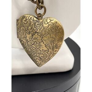 a detailed, vintage-style heart-shaped locket pendant hanging from a thick, antiqued gold-tone brass chain.