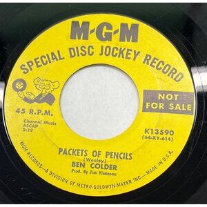 Rare 45 RPM vinyl record featuring Sheb Wooley as Ben Colder, showcasing tracks "Almost Persuaded No. 2" and "Packets of Pencils." Collectible MGM release.