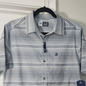 Stay cool and look sharp on or off the course with this Ben Hogan performance golf shirt. Designed with a sleek horizontal stripe pattern in gray and white, it’s perfect for golf, casual Fridays, or summer outings.