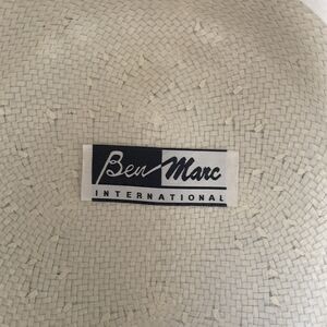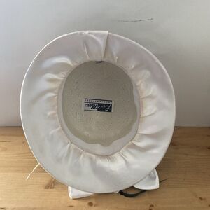 This is a stunning Ben Marc structured hat. It is a straw hat wrapped in polyester felt with white satin ribbons and trim, and a large three-dimensional satin rose on the back. The exterior is in beautiful condition. The underside had a considerable makeup stain, and has been carefully hand-washed to remove most of it. The satin trim is still slightly discolored right where the brim meets the crown, but it is not visible when the hat is in use. Please see photos for details.