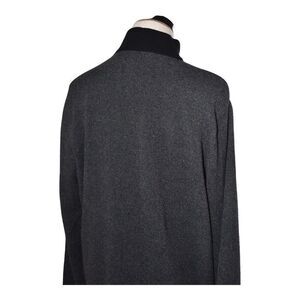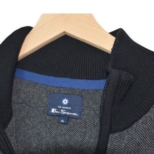 This Ben Sherman sweater delivers clean British mod styling with a modern casual edge. Crafted in a textured charcoal knit with contrasting black rib collar and cuffs, it features a half-zip mock neck silhouette that layers effortlessly over tees or button-ups. Size XL, recycled cotton blend.