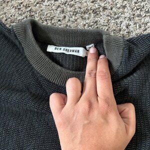 This waffle knit gray sweater by Ben Sherman is designed for casual wear, offering both comfort and style with its durable fabric and ribbed accents.
