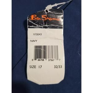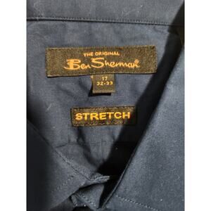 New with tags! Ben Sherman men's stretch dress shirt, size 17 neck / 32-33 sleeve. Classic navy blue color in a long sleeve button-down style. Made of 97% cotton and 3% spandex for added comfort and flexibility. Great for work, events, or everyday wear. Shirt is new and unworn, but tag shows some wear from storage—see photos for details, measurements, and fabric content.
