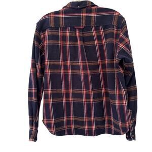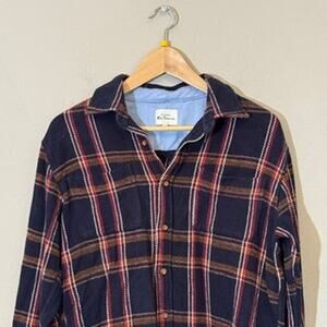- Navy blue, red, tan, and white plaid flannel button down shirt