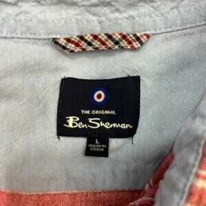 Ben Sherman short sleeve button-down in pink, red & white stripes. Size Large. Lightweight linen-cotton blend (material tag removed). Excellent preowned condition, from a smoke-free home. A versatile piece—perfect for vacation, Easter, church, or a business casual look. Style with khakis or shorts for a preppy vibe, or layer open over a tee for a relaxed resort fit. Machine washable. Model shown for fit reference only.