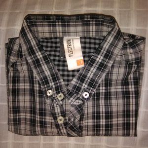 Long sleeve plaid Plectrum shirt by Ben Sherman; black, white, gray; Slim fit style; goes with most colors, black, white, gray, charcoal pants;