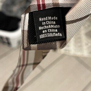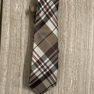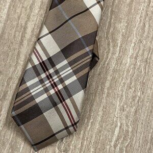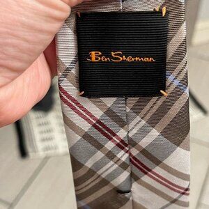 Elegant plaid necktie by Ben Sherman. Features brown and cream tones with a hint of red. Ideal for formal events.