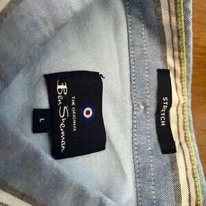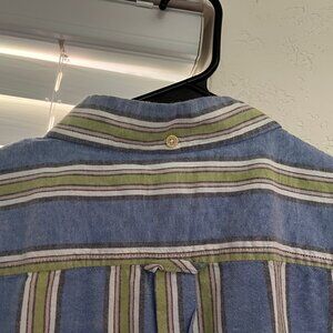 Short sleeve oxford retro shirt, light-denim blue with vintage green stripes.