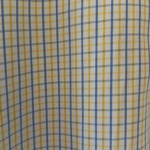 Traditional check button down shirt, with light blue as one of two colors, and yellow as an appealing contrast. Button down collar.