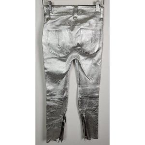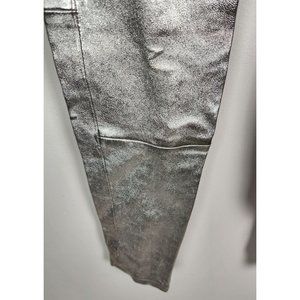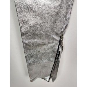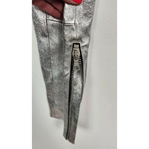These Unravel Project skinny pants are crafted from metallic silver lambskin leather. They feature a waist band with loops and buttons, middle front lace-up closure, two front slip pockets and two double zipper pockets, back yoke, back patch pockets,and bottom legs side zippers.
