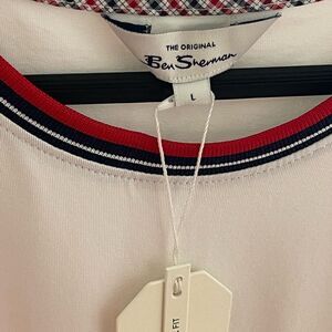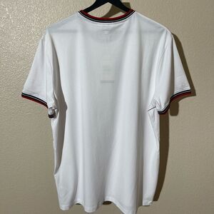 Classic white tee with stylish red and black trim. Features a convenient chest pocket. Ideal for everyday wear.