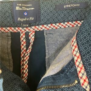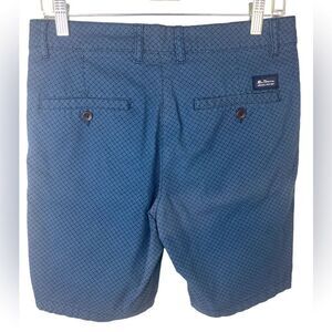 Navy men’s Ben Sherman flat front shorts with 2 hip slip pockets and 2 rear button closure pockets. 97% cotton and 3% spandex. Measurements are as follows: