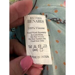 Unique and boho-chic Benares tunic dress with playful print and contrasting panel. Features a teal background with floral and bicycle motifs, accented with orange polka dots and a green inset at the front. Lightweight and flowy 100% viscose fabric—perfect for summer layering, festivals, or casual wear.