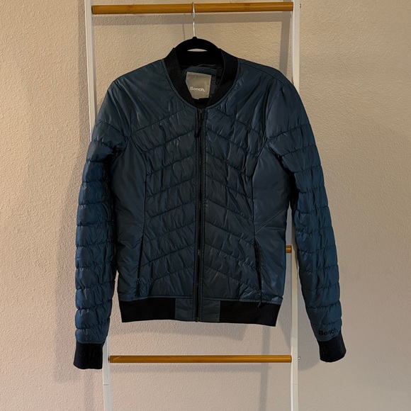 Stylish blue jacket by Bench. Versatile and comfortable. Perfect for any occasion. Zip pockets, thumb holes on sleeves