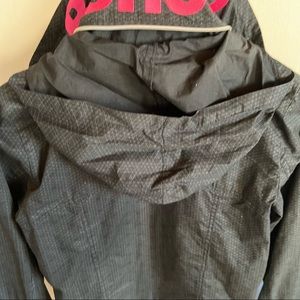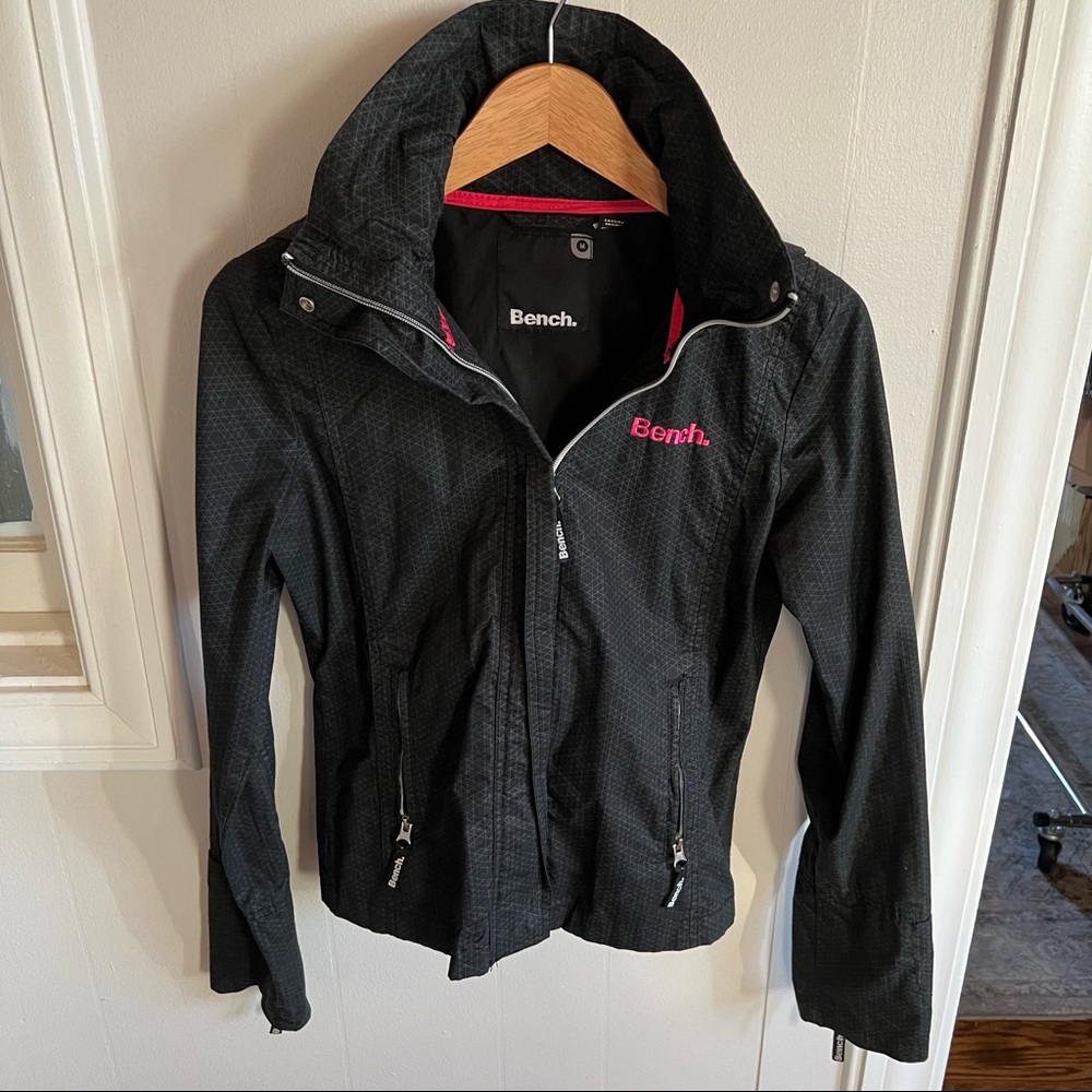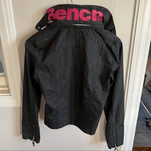 Bench, lite-weight jacket. Stand-up collar with roll up hood. Excellent condition, only worn twice.