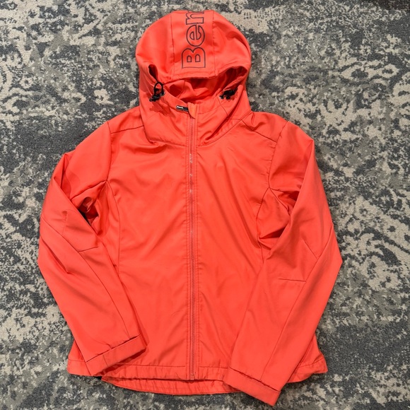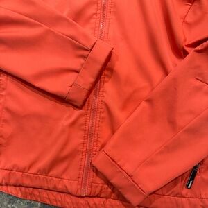 Bold coral jacket with hood. Features a front zipper. Ideal for outdoor wear. Good condition. Has been worn but has a lot of life left.