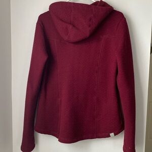 Very stylish women’s jacket. Textured material in a beautiful burgundy color. Light weight, no liner but it feels like a fleece material. Zippers on the pockets and sleeves have a thumb hole. Like new condition (no stains, no rips).
