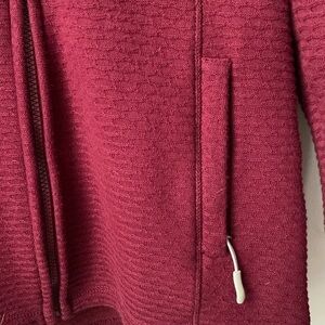 Very stylish women’s jacket. Textured material in a beautiful burgundy color. Light weight, no liner but it feels like a fleece material. Zippers on the pockets and sleeves have a thumb hole. Like new condition (no stains, no rips).