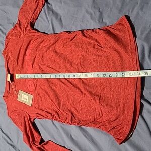 This Bench women's long sleeve t-shirt in size small features a solid red color with a pinkish tint, a round neckline, and a pullover closure. Made of 60% cotton and 40% polyester knit fabric, it has pleated accents, ruched sides, and the Bench logo. This casual t-shirt is easy to care for, lightweight, and suitable for winter, fall, and spring seasons. Perfect for everyday wear, it offers a regular fit and a comfortable casual sleeve style.