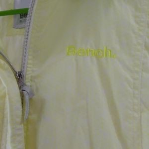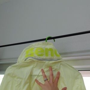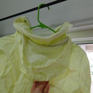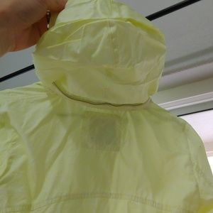 Lime green bench jacket. Good condition. Zipper in back holds hood.