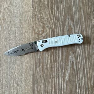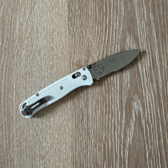 Custom bench made knife brand new never used white handle can be switched to left hand green accents