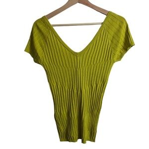Benetton Small Silk Cotton Chartreuse V-neck Short Sleeve Lightweight Top Spring