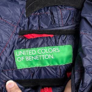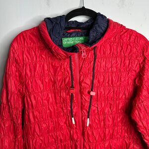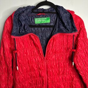 Benetton Women's Giaccone Zip Quilted Hooded Jacket Anorak - Cherry Red - Size Large. In good preowned condition, no bottom drawstring. It’s been removed. No other flaws.