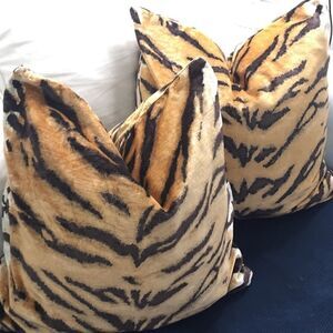 Front and back both Ralph Lauren “Bengal Tiger” silk, velvet pillows. Knife edge, hidden zipper closer. 24