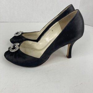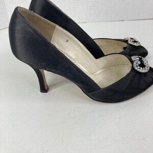 Benjamin Adams Womens Peep Toe Pump Shoes Sz 9 Black Satin Rhinestone 3.5" Heel