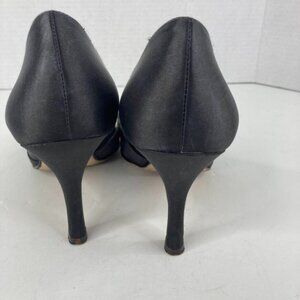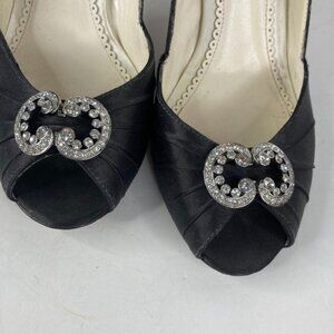 Benjamin Adams Womens Peep Toe Pump Shoes Sz 9 Black Satin Rhinestone 3.5" Heel Preowned