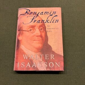 Benjamin Franklin An American Life by Walter Isaacson Biography Book Like new Explore the life of Benjamin Franklin with this engaging biography. The cover features a portrait of Franklin in shades of pink and cream.