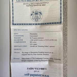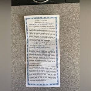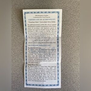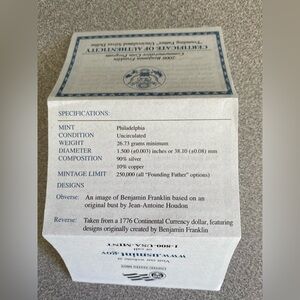 Benjamin Franklin Founding Father Commemorative Coin Program set with certificate. Includes a silver coin in a blue presentation box.