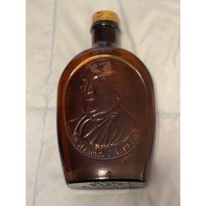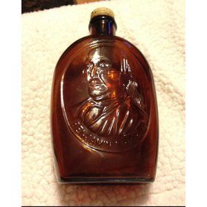 From my research this is a limited edition Log Cabin glass syrup bottle with Benjamin Franklin. No visible chips or cracks. Measurements 8 1/4”tall and 4 1/2” wide. Top is metal and has slight wear on it.