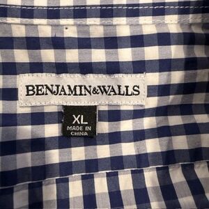 Benjamin & Walls Men's Button Front Shirt Navy Blue White Gingham Check Size XL. Excellent condition. See photos for details and unstretched measurements. View my closet to add other items and bundle to save with one shipping fee!