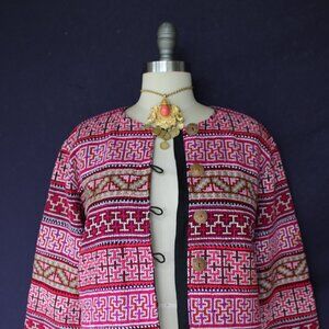 Super cool Vintage Bennett of Centreville jacket. Similar in style and design to some of vintage Ortega, Chimayo, Ralph Lauren, free people, and Anthropologie designs. Beautiful needlepoint embroidered Aztec, ethnic southwestern graphic pattern in tones of pink, black, white and greens. Darling shorter square design with a four wood button closure. Side pocket detail. Beautifully made in Thailand and lined in black cotton. Wear this beauty with your favorite Balmain leather pants, free people top and Gucci bag.