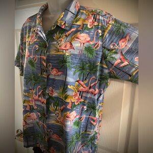 The ocean, pink flowers and flamingos, and palm trees make the perfect Hawaiian shirt! Has awesome wooden buttons. EXCELLENT condition.