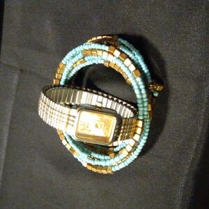 Vintage and Elegant Benrus watch with a gold-tone rectangular face. Features a classic design with easy-to-read numbers. New battery and keeps perfect time. Also a memory wire braclet.