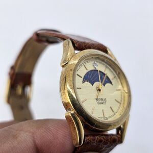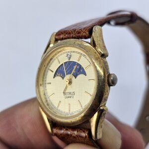 Benrus Women Watch Moon Phase25MM Gold Dial Case Brown Leather Bands New Battery
