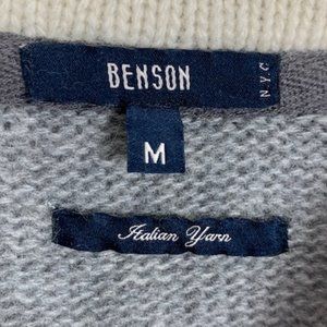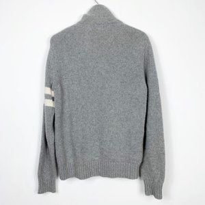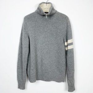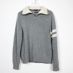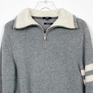 Benson 1/4 zip sweater. Gray with cream collar & stripes on left sleeve. Ribbed cuffs & bottom. Italian yarn. Lambswool blend. In excellent condition.