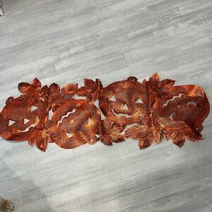 Decorative table runner with pumpkin and leaf design. Perfect for fall decor.