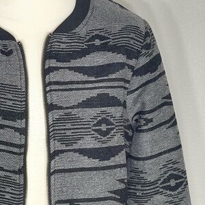 This is a women's bomber jacket by the brand Bentee, featuring an aztec pattern in charcoal and black colors. The jacket is made of a wool blend fabric with a zip closure, long sleeves, and pockets. It is a size Large and has a short length. The style is tribal-inspired, giving it a unique and trendy look.