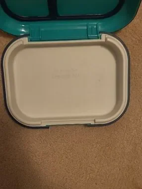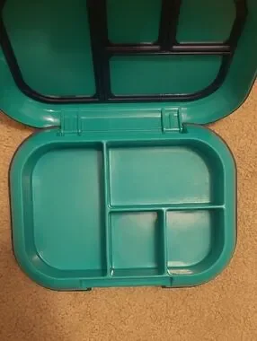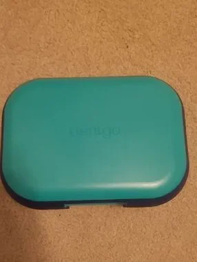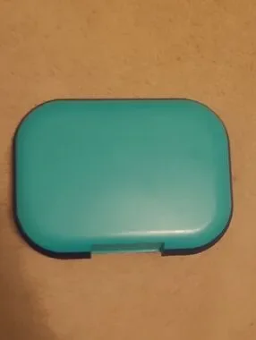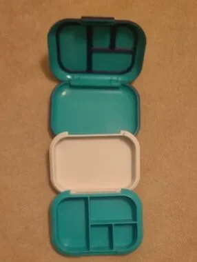 Bright teal plastic compartment box with three stackable tiers. Multiple divided sections for snacks or small items. It is lightweight and easy to use.