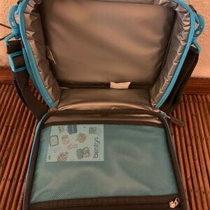 The insulated lunch bag keeps food fresh and cool all day, with a roomy interior, easy-to-clean lining, and extra mesh storage for utensils, napkins, or an ice pack. Its bright blue trim, comfy handle, and adjustable strap make it easy for kids to carry on their own.