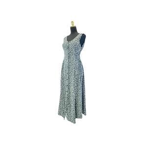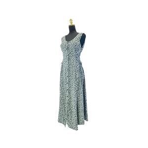 The sleeveless design and scoop neckline create a classic and flattering silhouette, while the delicate black and blue floral print adds a touch of vintage-inspired charm. The tie-back waist allows for a customized fit, accentuating your curves in all the right places.