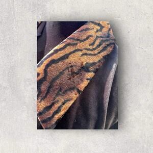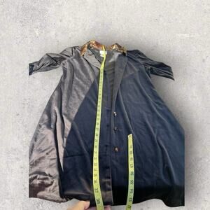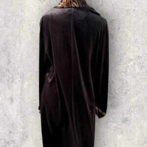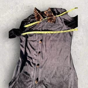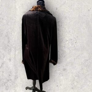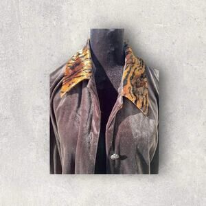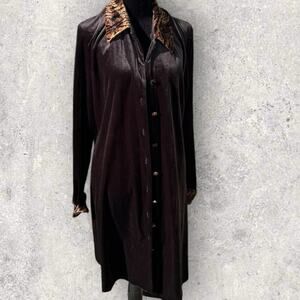 Bentley women’s size 12. Black velvet velour, button-down, leopard collar, top/jacket/cover-up.. very black. Collar, sleeve cuffs and buttons are all leopard print. Great condition smoke-free home.