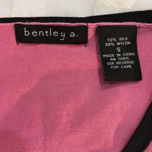 Bentley A. pink and black asymmetrical neckline sleeveless sweater top. New without tags. Underarm seam to underarm seam measures 17 inches (flat). Shoulder seam to hem measures 21 inches long. Silk/Nylon blend. Hand wash. Size Small.
