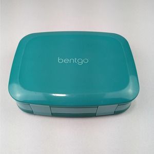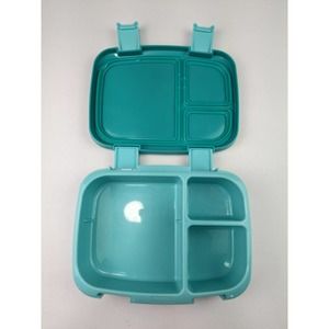 Bento 3 compartment lunch box container, clips shut, very good condition, does have a few scuffs on the outside, teal color