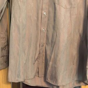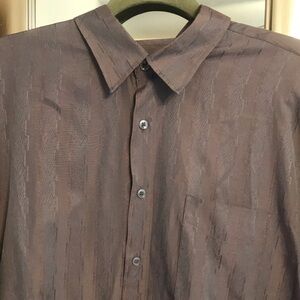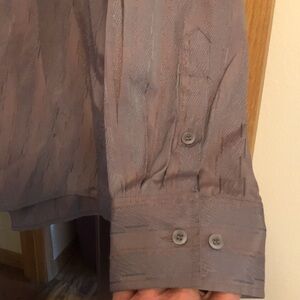 Very nice dress shirt. Button up and buttons at cuffs. Purple with faint blue and orange. Benzene brand size XL. 60% polyester 40% cotton