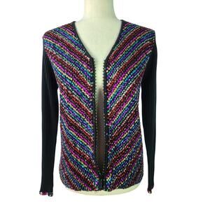 Berek Black Red Blue Sequin Embellished Bling Rib Knit Zip Up Sweater Medium
